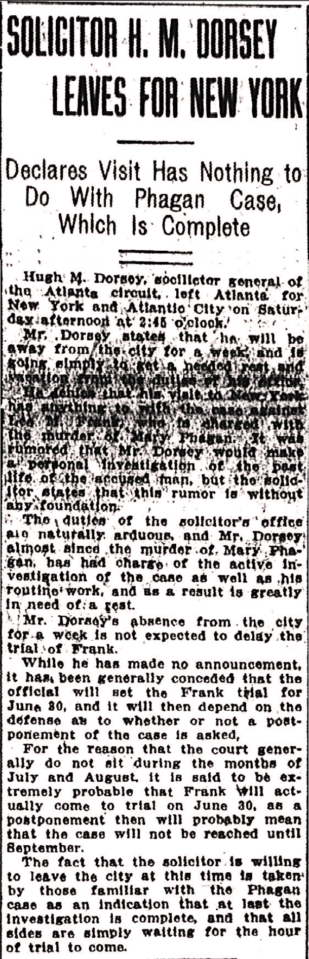 Mr. Dorsey states that he will be away from the city for a week, and is going simply to get a needed rest, and vacation from the duties of his office. He denies that his visit to New York has anything to do with the case against Leo M. Frank, who is charged with the murder of Mary Phagan. It was rumored that Mr. Dorsey would make a personal investigation of the past life of the accused man, but the solicitor states that this rumor is without any foundation.
