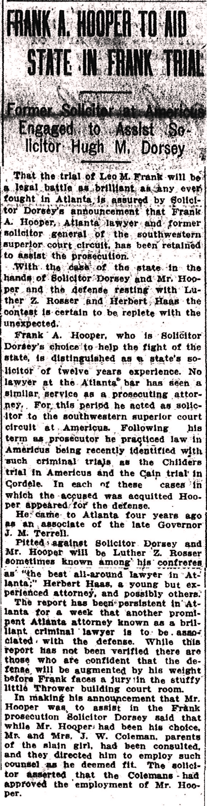 That the trial of Leo M. Frank will be a legal battle as brilliant as any ever fought in Atlanta is assured by Solicitor Dorsey's announcement that Frank A. Hooper, Atlanta lawyer and former solicitor general of the southwestern superior court circuit, has been retained to assist the prosecution.