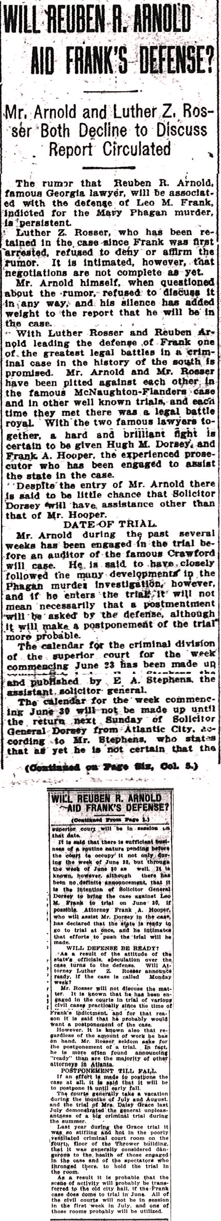 With Luther Rosser and Reuben Arnold leading the defense of Frank one of the greatest legal battles in a criminal case in the history of the south is promised. Mr. Arnold and Mr. Rosser have been pitted against each other in the famous McNaughton-Flanders case and in other well known trials, and each time they met there was a legal battle royal. With the two famous lawyers together, a hard and brilliant fight is certain to be given Hugh M. Dorsey, and Frank A. Hooper, the experienced prosecutor who has been engaged to assist the state in the case.