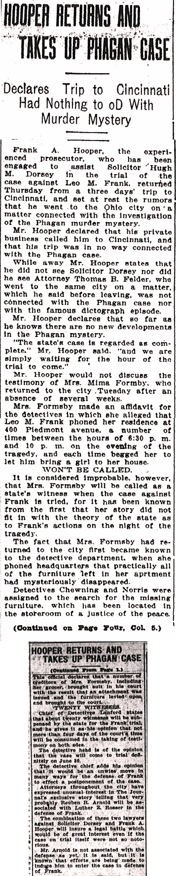 Frank A. Hooper, the experienced prosecutor, who has been engaged to assist Solicitor Hugh M. Dorsey in the trial of the case against Leo M. Frank, returned Thursday from a three days' trip to Cincinnati, and set at rest the rumors that he went to the Ohio city on a matter connected with the investigation of the Phagan murder mystery.