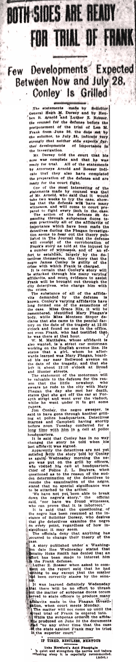 The statements made by Solicitor General Hugh M. Dorsey and by Reuben R. Arnold and Luther Z. Rosser, the counsel for the defense before the postponement of the trial of Leo M. Frank from June 30, the date set by the solicitor, to July 28, indicate very strongly that neither side expects further developments of importance in the investigation.
