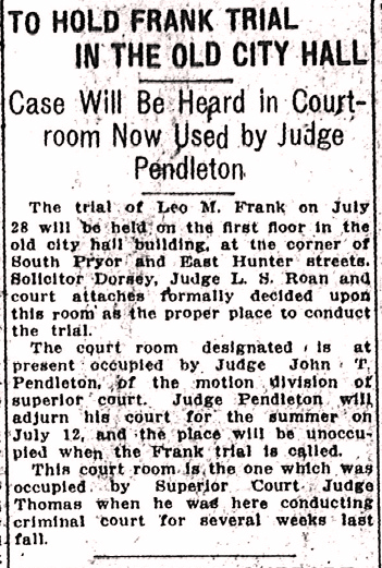 The trial of Leo M. Frank on July 28 will be held on the first floor in the old city hall building, at the corner of South Pryor and East Hunter streets. Solicitor Dorsey, Judge L. S. Roan and court attaches formally decided upon this room as the proper place to conduct the trial.