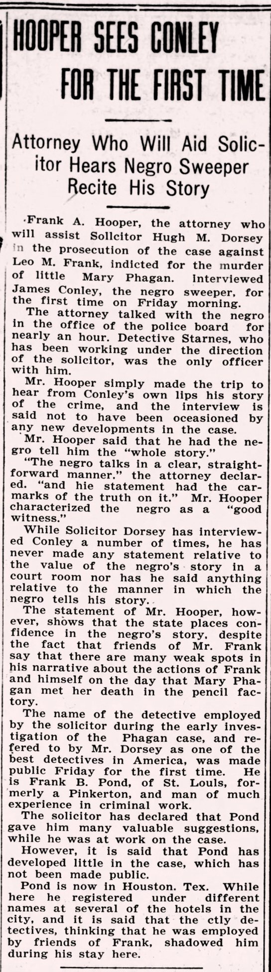 Frank A. Hooper, the attorney who will assist Solicitor Hugh M. Dorsey in the prosecution of the case against Leo M. Frank, indicted for the murder of little Mary Phagan, interviewed James Conley, the negro sweeper, for the first time on Friday morning.