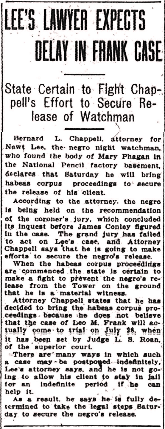 Bernard L. Chappell, attorney for Newt Lee, the negro night watchman, who found the body of Mary Phagan in the National Pencil factory basement, declares that Saturday he will bring habeas corpus proceedings to secure the release of his client.