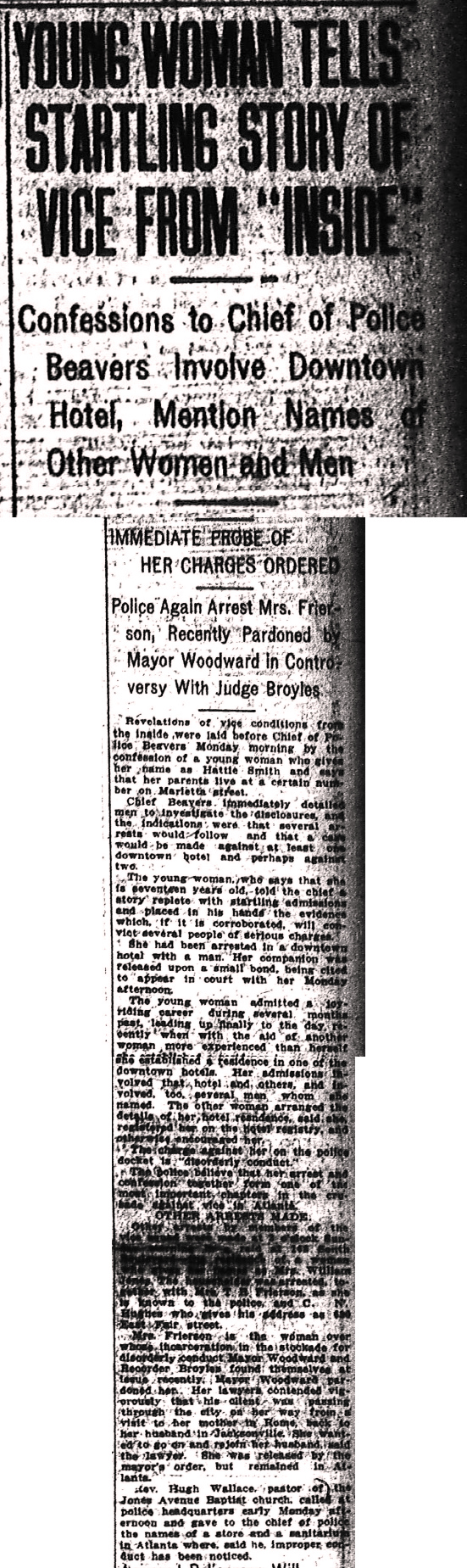 Revelations of vice conditions from the inside were laid before Chief of Police Beavers Monday morning by the confession of a young woman who gives her name as Hattie Smith and says that her parents live at a certain number on Marietta street.