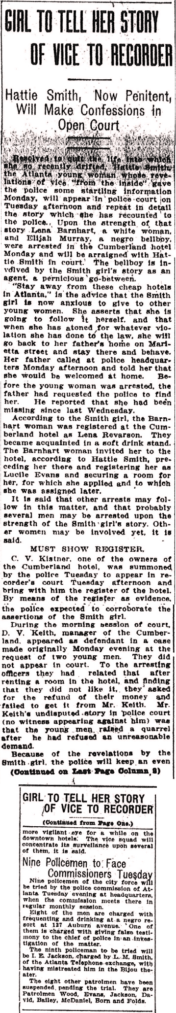 Resolved to quit the life into which she so recently drifted, Hattie Smith, the Atlanta young woman whose revelations of vice "from the inside" gave the police some startling information Monday, will appear in police court on Tuesday afternoon and repeat in detail the story which she has recounted to the police. Upon the strength of that story Lena Barnhart, a white woman, and Elijah Murray, a negro bellboy, were arrested in the Cumberland hotel Monday and will be arraigned with Hattie Smith in court. The bellboy is involved by the Smith girl's story as an agent, a pernicious go-between.