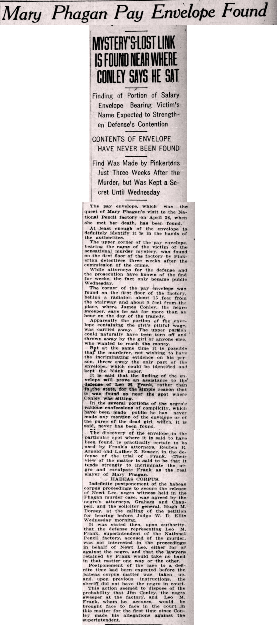It is said that the finding of the envelope will prove an assistance to the defense of Leo M. Frank, rather than to the state, for the simple reason that it was found so near the spot where Conley was sitting.