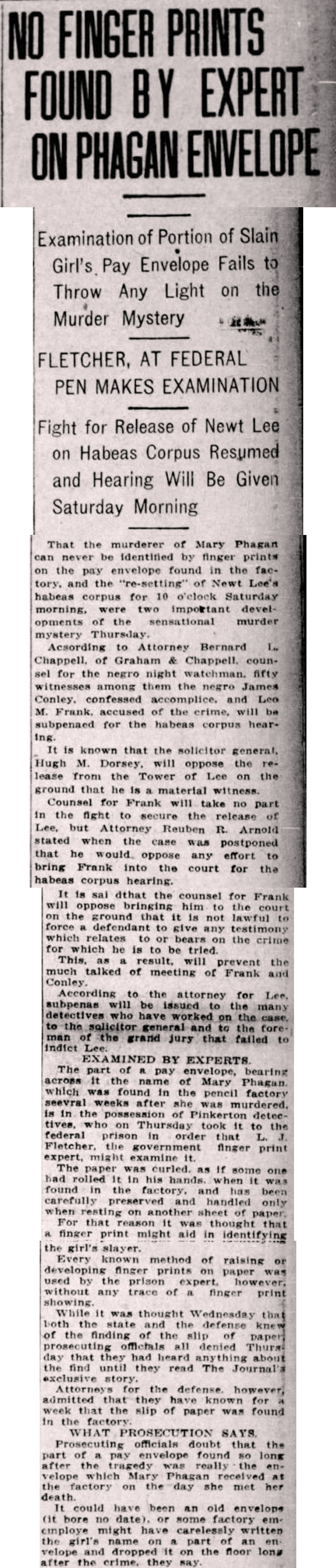 That the murderer of Mary Phagan can never be identified by finger prints on the pay envelope found in the factory, and the "re-setting" of Newt Lee's habeas corpus for 10 o'clock. Saturday morning, were two important developments of the sensational murder mystery Thursday.