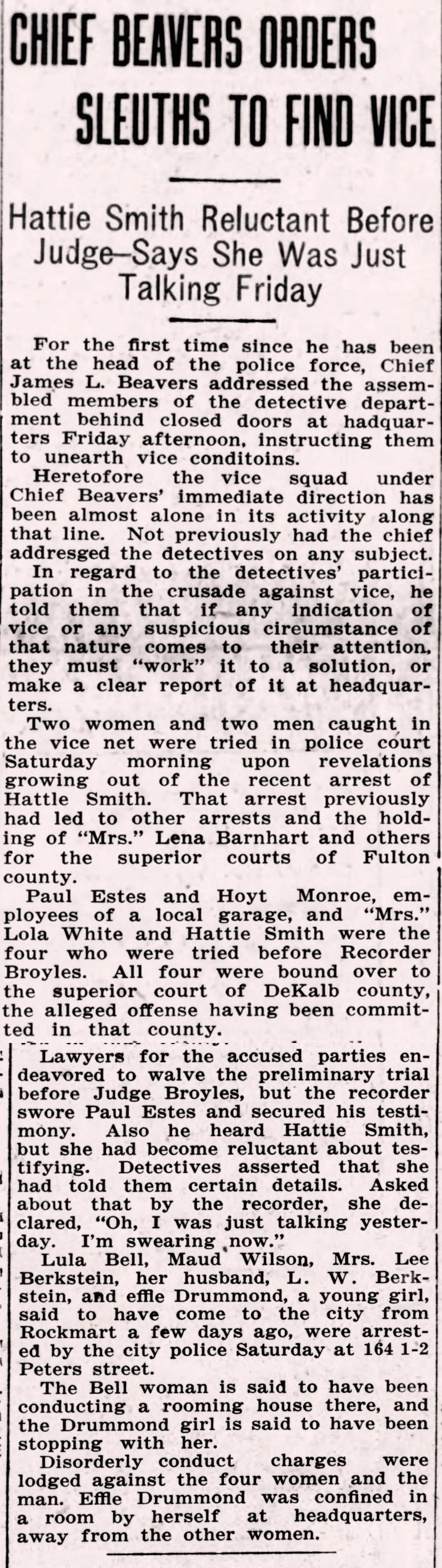 Paul Estes and Hoyt Monroe, employees of a local garage, and "Mrs." Lola White and Hattie Smith were the four who were tried before Recorder Broyles. All four were bound over to the superior court of DeKalb county, the alleged offense having been committed in that county.