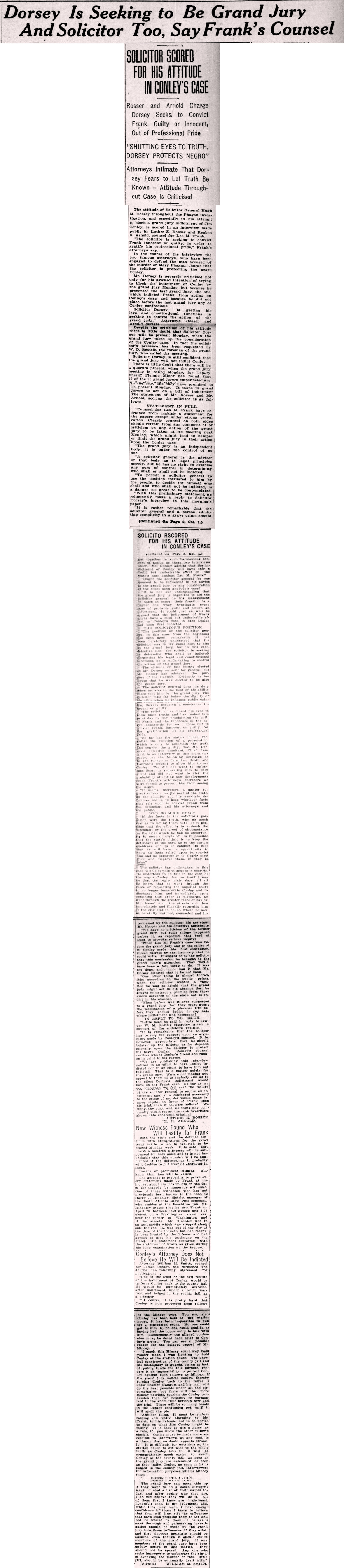 […]get together in such harmonious concert of action as these two interviews show. Mr. Dorsey admits that the indictment of Conley will have only a mild but undesirable effect on the state's case against Leo M. Frank."