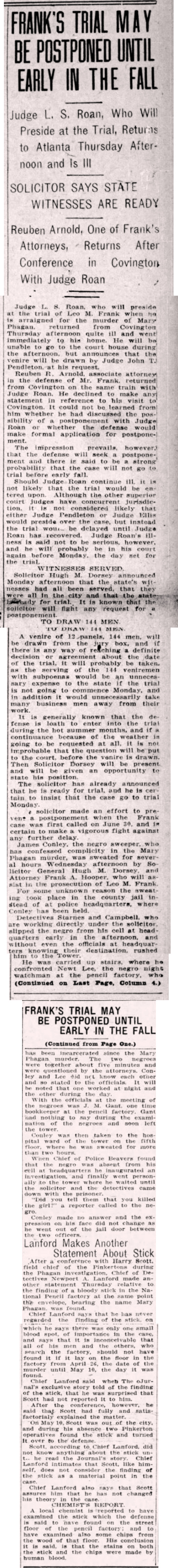 Judge L. S. Roan, who will preside at the trial of Leo M. Frank when he is arraigned for the murder of Mary Phagan, returned from Covington Thursday afternoon quite ill and went immediately to his home. He will be unable to go to the court house during the afternoon, but announces that the venire will be drawn by Judge John T. Pendleton, at his request.