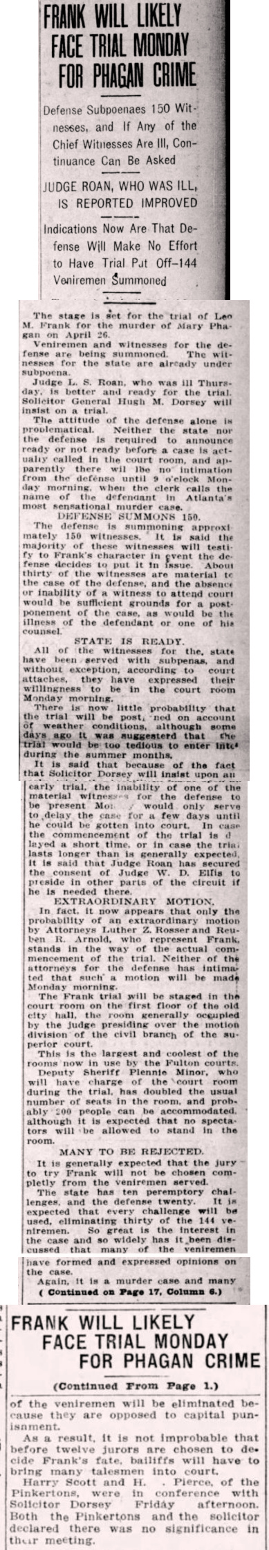 The stage is set for the trial of Leo M. Frank for the murder of Mary Phagan on April 26.
