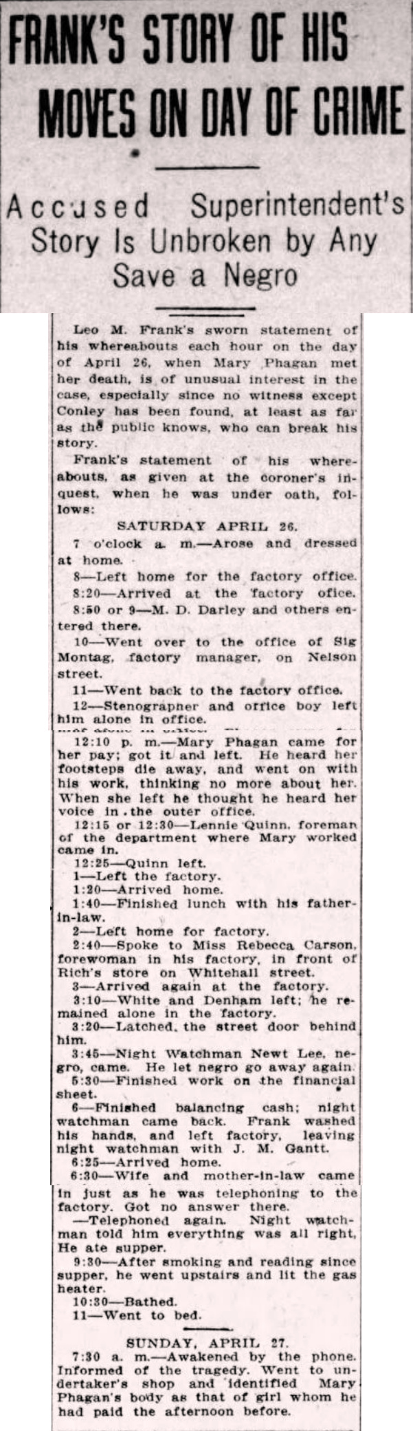 Leo M. Frank's sworn statement of his whereabouts each hour on the day of April 26, when Mary Phagan met her death, is of unusual interest in the case, especially since no witness except Conley had been found, at least as far as the public knows, who can break his story.