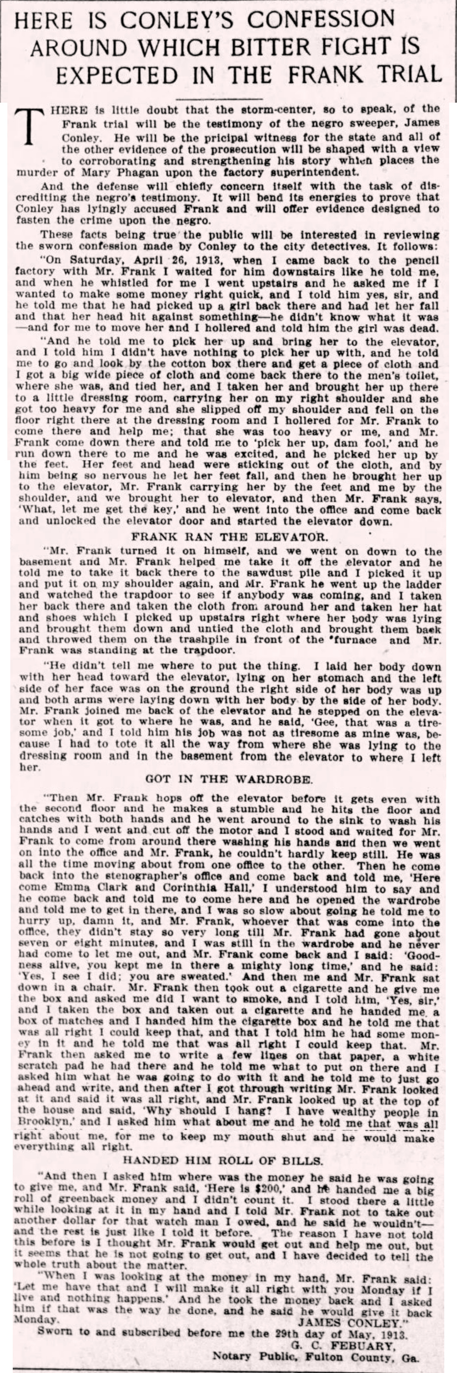 These facts being true the public will be interested in reviewing the sworn confession made by Conley to the city detectives. It follows:
