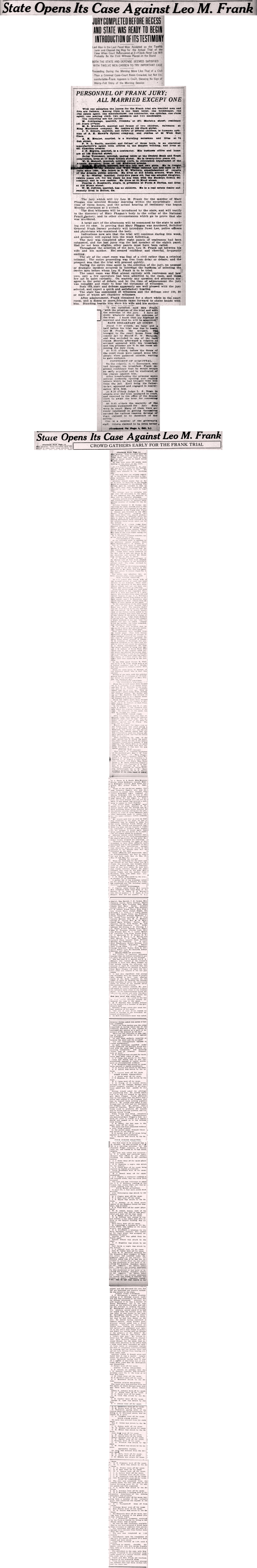 "I am satisfied," said Mrs. Frank, "with the progress of the trial and with the selection of the jury. I have no doubt whatever about the outcomes of the trial. I know that my husband is innocent and that he will be acquitted."