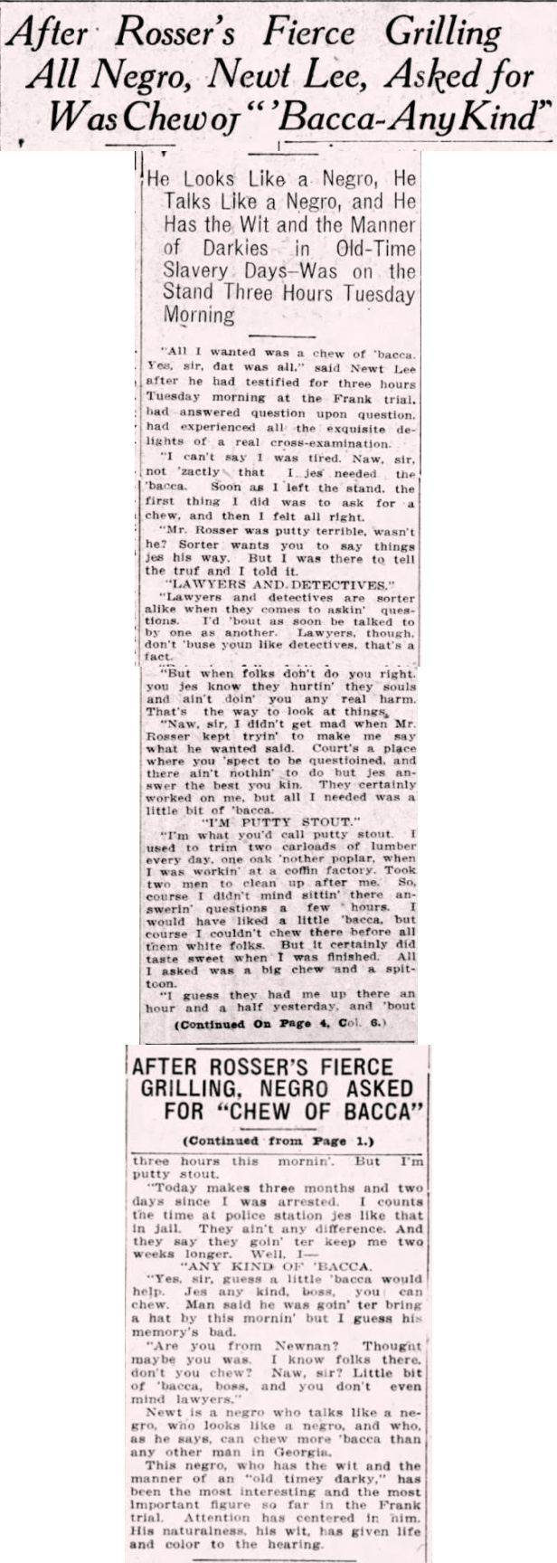 "All I wanted was a chew of ‘bacca. Yes, sir, dat was all," said Newt Lee after he had testified for three hours Tuesday morning at the Frank trial, had answered question upon question, had experienced all the exquisite delights of a real cross-examination.