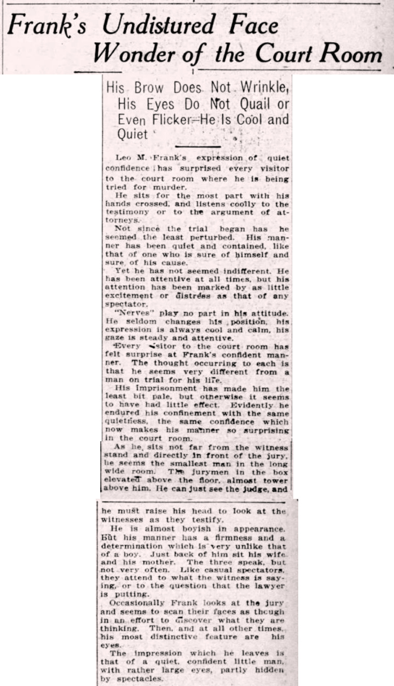 Every visitor to the court room has felt surprise at Frank's confident manner. The thought occurring to each is that he seems very different from a man on trial for his life.
