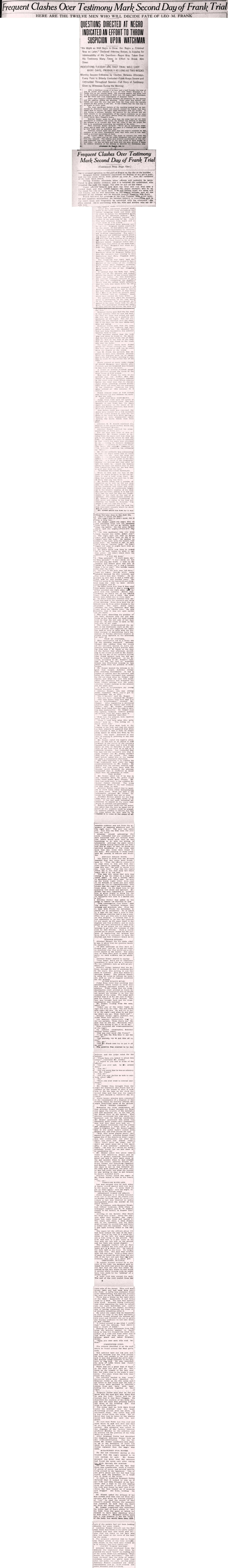 No further effort, however, was made to connect Lee with the murder. The negro was on the stand altogether just four hours and forty-five minutes. The tedious and detailed examination of his witness indicated that every point in the case would be hard fought by both sides. He was led back and forth over the same ground, it being the evident intention of the defense to discredit his statements relating to unusual agitation on the part of Frank on the day of the murder.