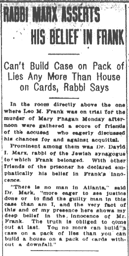 Prominent among them was Dr. David I. Marx, rabbi of the Jewish synagogue to which Frank belonged. With other friends of the prisoner he declared emphatically his belief in Frank's innocence.