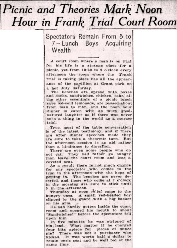A court room where a man is on trial for his life is a strange place for a picnic, yet from 12:30 to 2 o'clock every afternoon the room where the Frank trial is taking place has all the appearance of the pavillion at Grant park on a hot July Saturday.