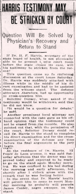 In the event that Dr. Harris' health will permit him to come to court Monday morning he probably will precede James Conley, negro sweeper, on the stand.