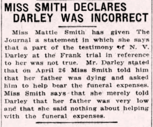 Miss Mattie Smith has given The Journal a statement in which she says that a part of the testimony of N. V. Darley at the Frank trial in reference to her was not true. Mr. Darley stated that on April 26 Miss Smith told him that her father was dying and asked him to help bear the funeral expenses. Miss Smith says that she merely told Darley that her father was very low and that she said nothing about helping with the funeral expenses.