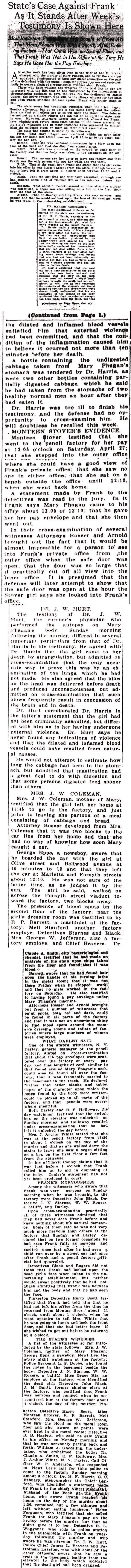 A list of the witnesses so far introduced by the state follows: Mrs. J. W. Coleman, mother of Mary Phagan; George Epps, a newsboy; Newt Lee, the negro night watchman at the factory; Police Sergeant L. S. Dobbs, who found the notes in the basement beside the body; Detective J. N. Starnes, W. W. Rogers, a bailiff; Miss Grace Hix, an employe at the factory, who identified the dead girl; Detective John Black, J. M. Gantt, former ship[p]ing clerk at the factory, who testified that Frank was nervous and jumped when he encountered him at the factory door about 6 o'clock the day of the murder; Pinkerton Detective Harry Scott, Miss Monteen Sttover [sic], R. P. Barrett, Mell Stanford, Mrs. George W. Jefferson, who saw the blood on the metal room floor and who swore no paints were ever kept in the metal room; Detective B. B. Haslett, who said he saw Frank in his office on Monday morning and that he was nervously pacing back and forth; William A. Gheesling, the undertaker, who embalmed the body; Dr. Claude A. Smith, E. F. Holloway, Mrs. J. Arthur White, N. V. Darley, Call Officer W. F. Anderson, who responded to Newt Lee's call for thhe [sic] police to come to the factory Sunday morning amout [sic] 3 o'clock; Dr. H. F. Harris, G. C. Febuary, stenographer tto [sic] Chief Lanford, who identified a statement made by Frank to the chief; Albert McKnight, husband of the cook at the Frank home, who swore Frank reached his home on the day of the murder about 1:30, remained but a few minutes and left without eating luncheon; Helen Ferguson, who testified that she asked Frank for Mary Phagan's pay on the Friday before the murder, but that he didn't give it to her; Detective R. L. Waggoner, who rode to police station in the automobile with Frank on Tuesday following the murder and who swore he was nervous; Dr. J. W. Hurt, Police Chief James L. Beavers and Patrolman Lassiter, who with some of the other officers, swore that he saw a trail in the basement, leading from the elevator to the body which indicated that the dead girl had been dragged.