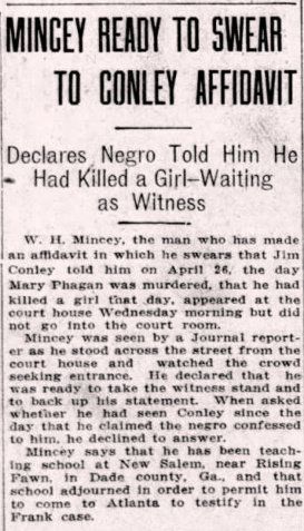 Mincey was seen by a Journal reporter as he stood across the street from the court house and watched the crowd seeking entrance. He declared that he was ready to take the witness stand and to back up his statement. When asked whether he had seen Conley since the day that he claimed the negro confessed to him, he declined to answer.