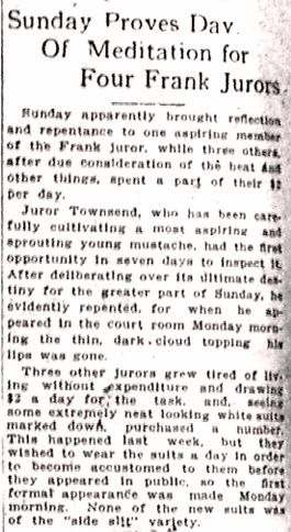 Juror Townsend, who has been carefully cultivating a most aspiring and sprouting young mustache, had the first opportunity in seven days to inspect it. After deliberating over its ultimate destiny for the greater part of Sunday, he evidently repented, for when he appeared in the court room Monday morning the thin, dark cloud topping his lips was gone.