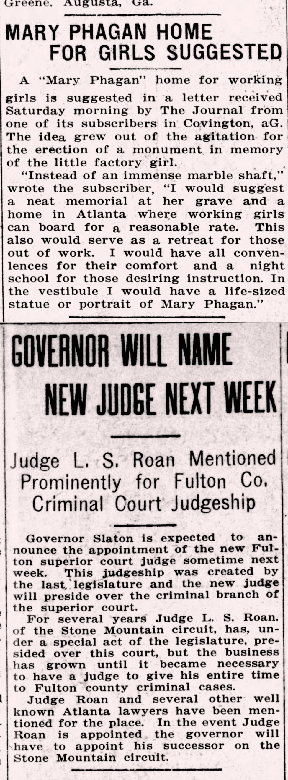 "Instead of an immense marble shaft," wrote the subscriber, "I would suggest a neat memorial at her grave and a home in Atlanta where working girls can board for a reasonable rate. This also would serve as a retreat for those out of work. I would have all conveniences for their comfort and a night school for those desiring instruction. In the vestibule I would have a life-sized statue or portrait of Mary Phagan."