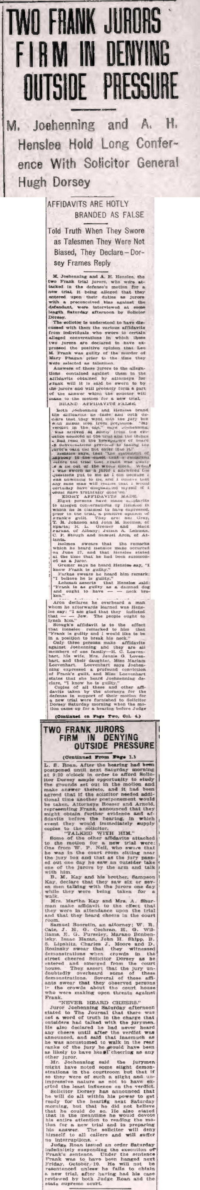 M. Joehenning and A. H. Henslee, the two Frank trial jurors, who were attacked in the defense's motion for a new trial, it being alleged that they entered upon their duties as jurors with a preconceived bias against the defendant, were interviewed at some length Saturday afternoon by Solicitor Dorsey.