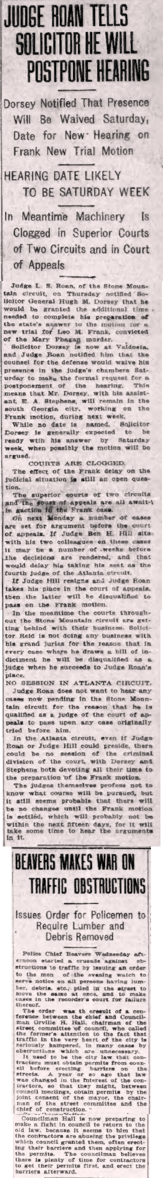 Judge L. S. Roan, of the Stone Mountain circuit, on Thursday notified Solicitor General Hugh M. Dorsey that he would be granted the additional time needed to complete his preparation of the state's answer to the motion for a new trial for Leo M. Frank, convicted of the Mary Phagan murder.