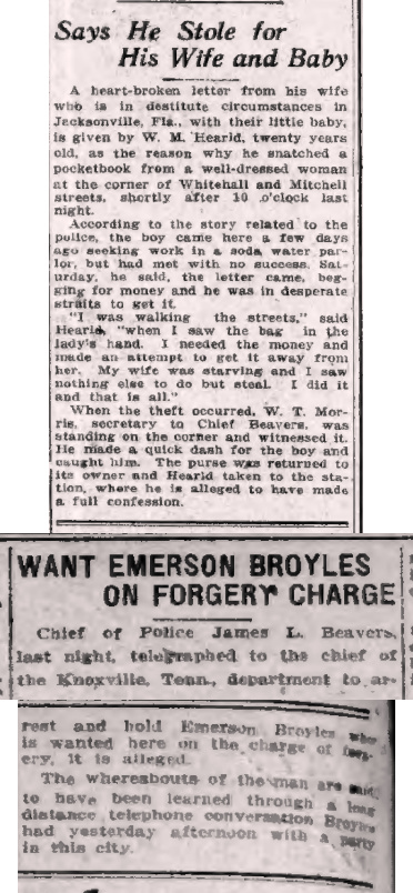 WANT EMERSON BROYLES ON FORGERY CHARGE Chief of Police James L. Beavers last night, telegraphed to the chief of the Knoxville, Tenn., department to arrest and hold Emerson Broyles who is wanted here on the charge of forgery, it is alleged.