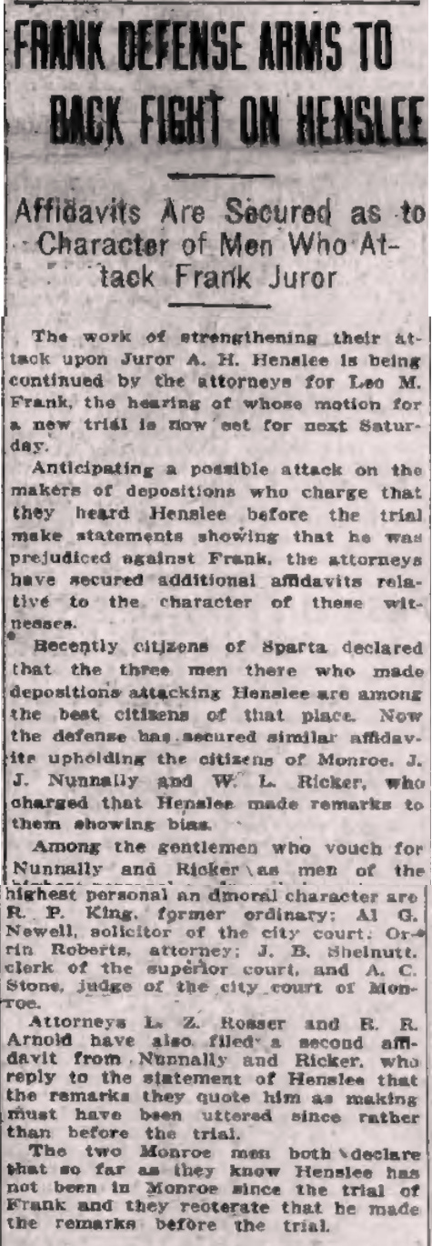 A. H. Henslee is being continued by the attorneys for Leo M. Frank, the hearing of whose motion for a new trial is now set for next Saturday.