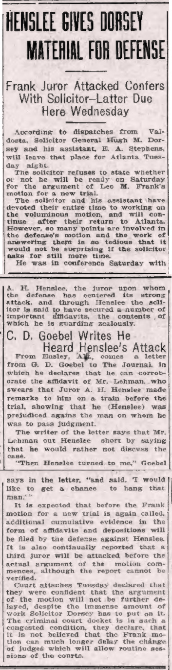 He was in conference Saturday with A. H. Henslee, the juror upon whom the defense has centered its strong attack, and through Henslee the solicitor is said to have secured a number of important affidavits, the contents of which he is guarding zealously.
