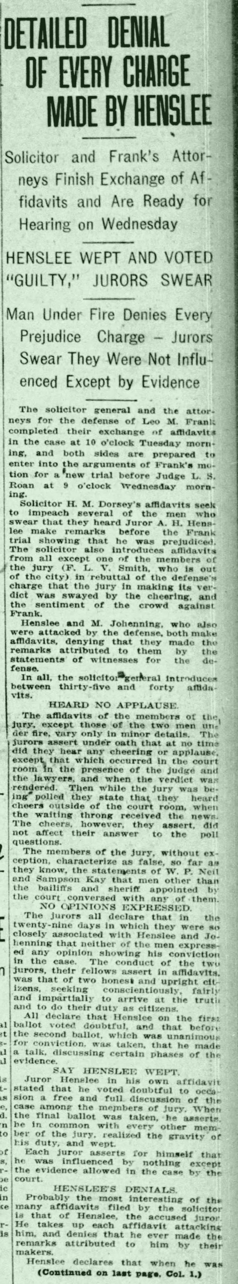 Solicitor and Frank's Attorneys Finish Exchange of Affidavits and Are Ready for Hearing on Wednesday HENSLEE WEPT AND VOTED "GUILTY,"