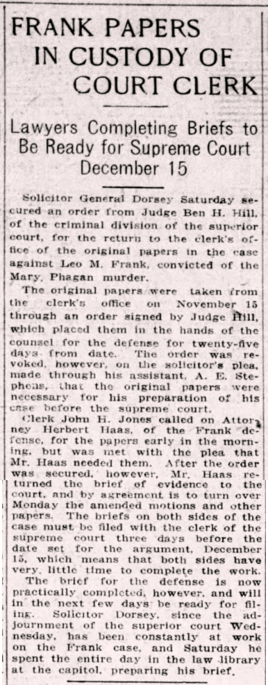 Clerk John H. Jones called on Attorney Herbert Haas, of the Frank defense, for the papers early in the morning, but was met with the plea that Mr. Haas needed them.