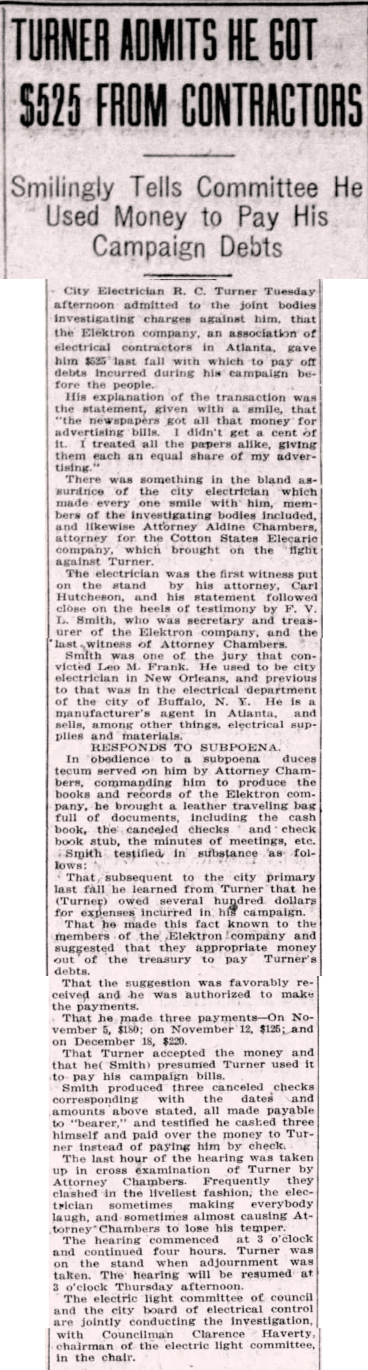 City Electrician R. C. Turner Tuesday afternoon admitted to the joint bodies investigating charges against him, that the Elektron company, an association of the electrical contractors in Atlanta, gave him $525 last fall with which to pay off debts incurred during his campaign before the people.