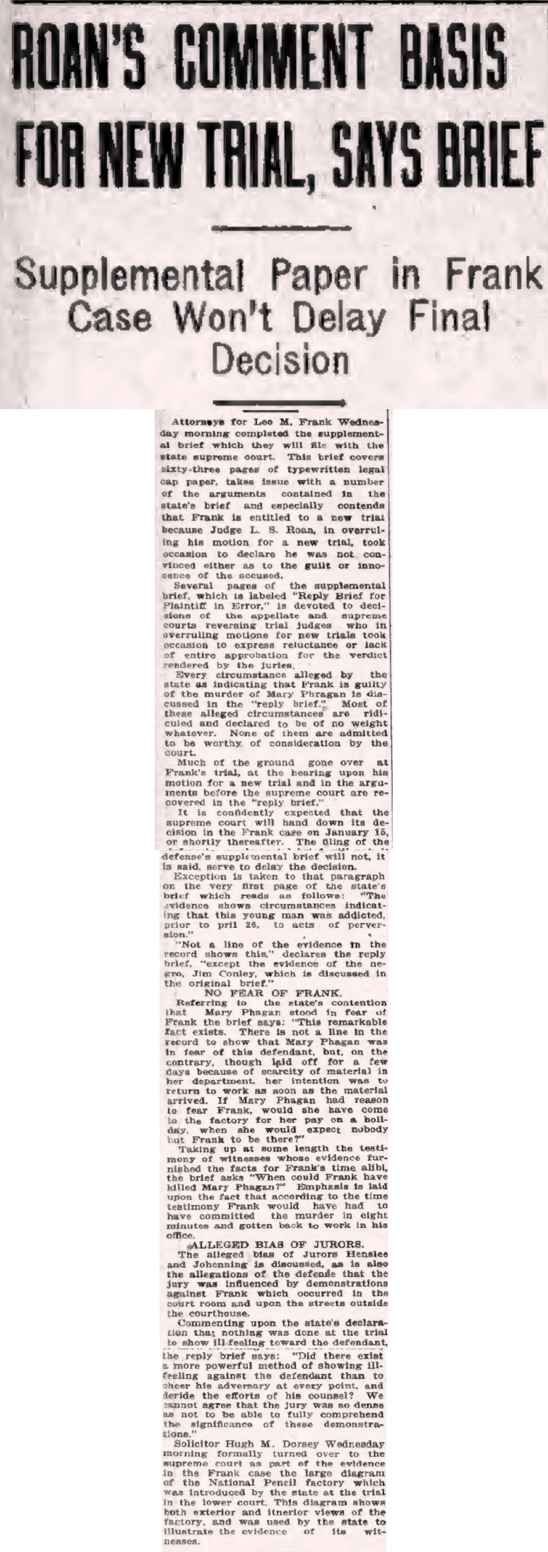 It confidently expected that the supreme court will hand down its decision in the Frank case on January 15, or shortly thereafter.
