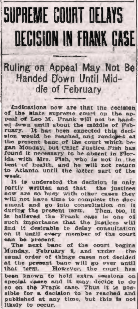 Indications now are that the decision of the state supreme court on the appeal of Leo M. Frank will not be handed down until about the middle of February.