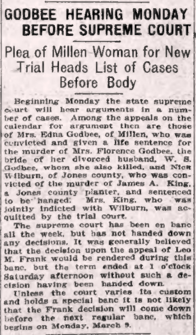 Among the appeals on the calendar for argument then are those of Mrs. Edna Godbee, of Millen, who was convicted and given a life sentence for the murder of Mrs. Florence Godbee, the bride of her divorced husband, W. S. Godbee, whom she also killed, and Nick Wilburn, of Jones County, who was convicted of the murder of James A. King, a Jones County planter, and sentenced to be hanged.