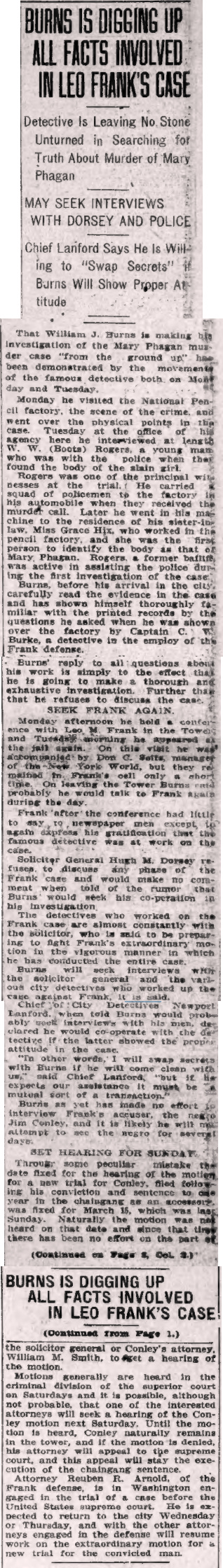 BURNS IS DIGGING UP ALL FACTS INVOLVED IN LEO FRANK'S CASE (Continued from page 1.)