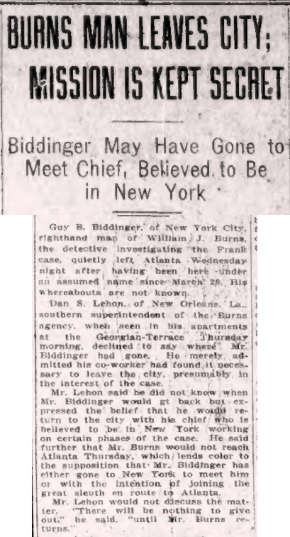 Mr. Lehon said he did not know when Mr. Biddinger would return but expressed the belief that he would come back to the city with his chief, who is believed to be in New York working on certain phases of the case. He further stated that Mr. Burns would not reach Atlanta on Thursday, which lends color to the supposition that Mr. Biddinger has either gone to New York to meet him or with the intention of joining the great sleuth en route to Atlanta.