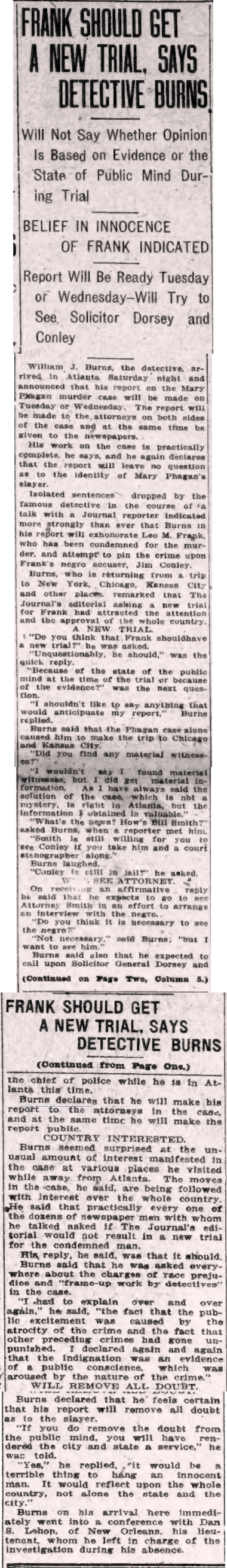 Burns declares that he will make his report to the attorneys in the case, and at the same time he will make the report public. Burns seemed surprised at the unusual amount of interest manifested in the case at various places he visited while away from Atlanta. The moves in the case, he said, are being followed with interest over the whole country. He said that practically every one of the dozens of newspaper men with whom he talked asked if The Journal's editorial would not result in a new trial for the condemned man. His reply, he said, was that it should.