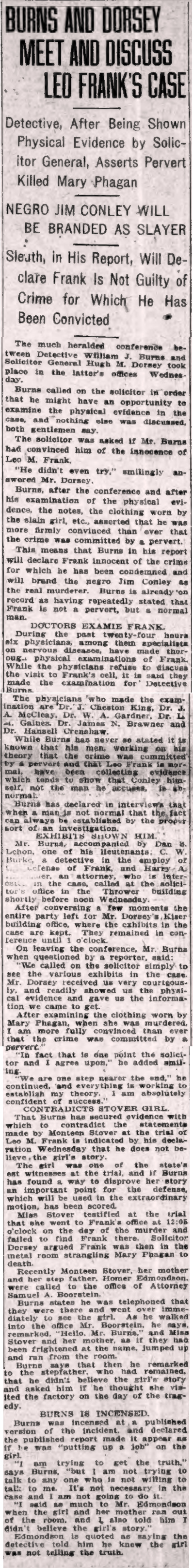 Detective William J. Burns, after being shown physical evidence by Solicitor General Hugh M. Dorsey, asserts that a pervert killed Mary Phagan and that Negro Jim Conley will be branded as the slayer. In his report, Burns will declare Leo M. Frank innocent of the crime for which he has been convicted.