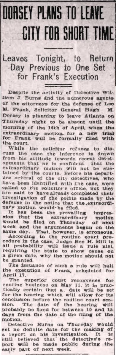 Despite the activity of Detective William J. Burns and the numerous agents of the attorneys for the defense of Leo M. Frank, Solicitor General Hugh M. Dorsey is planning to leave Atlanta on Thursday night to be absent until the morning of the 16th of April, when the extraordinary motion for a new trial for Frank will be formally filed with the court. While the solicitor refuses to discuss the case, the inference is drawn from his attitude towards recent developments that he is confident that the extraordinary motion will not be sustained by the courts. Before his departure, several of the city detectives, who have been identified with the case, were called to the solicitor's office, but they are said to have already completed their investigation of the points made by the defense in the notice that the extraordinary motion would be filed.