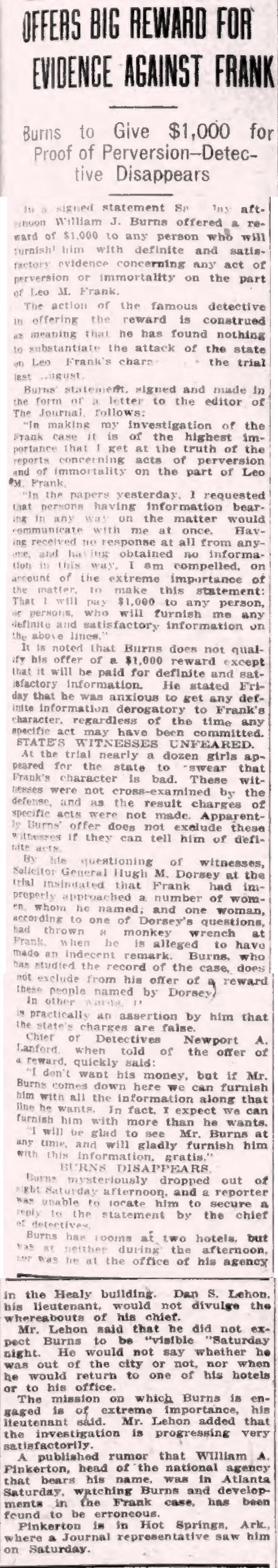 Burns' statement, signed and made in the form of a letter to the editor of The Journal, follows: "In making my investigation of the Frank case it is of the highest importance that I get at the truth of the reports concerning acts of perversion and of immorality on the part of Leo M. Frank. In the papers yesterday, I requested that persons having information bearing in any way on the matter would communicate with me at once. Having received no response at all from anyone, and having obtained no information in this way, I am compelled, on account of the extreme importance of the matter, to make this statement: That I will pay $1,000 to any person, or persons, who will furnish me any definite and satisfactory information on the above lines."