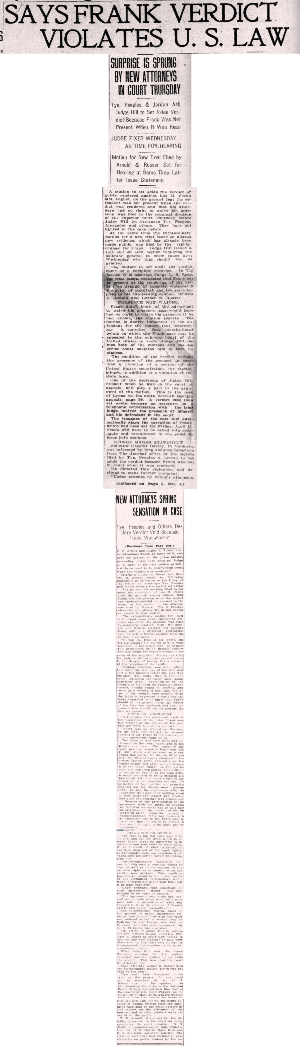 Tye, Peeples & Jordan have asked Judge Hill to set aside the verdict against Leo M. Frank because he was not present when it was read. Judge Hill has scheduled a hearing for Wednesday to address this motion, as well as a motion for a new trial filed by Arnold & Rosser. The motion to set aside the verdict was filed by attorneys Tye, Peeples, Alexander, and others, who are new to the case. At the same time, Frank's regular counsel filed an extraordinary motion for a new trial based on alleged new evidence. Judge Hill issued a rule nisi on both motions, requiring the solicitor general to show cause next Wednesday why they should not be granted.