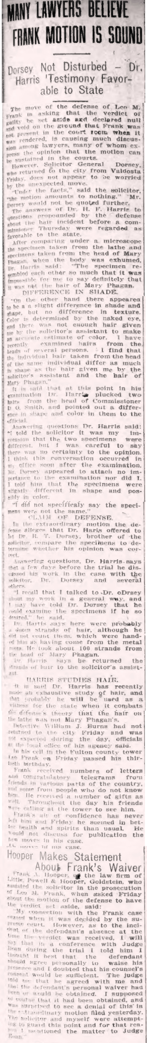 It is said Dr. Harris was recently made an exhaustive study of hair, and that probably he will be used as a witness for the state when it combats the defense's theory that the hair on the lathe was not Mary Phagan's. Detective William J. Burns had not returned to the city on Friday and was not expected during the day, officials at the local office of his agency said.