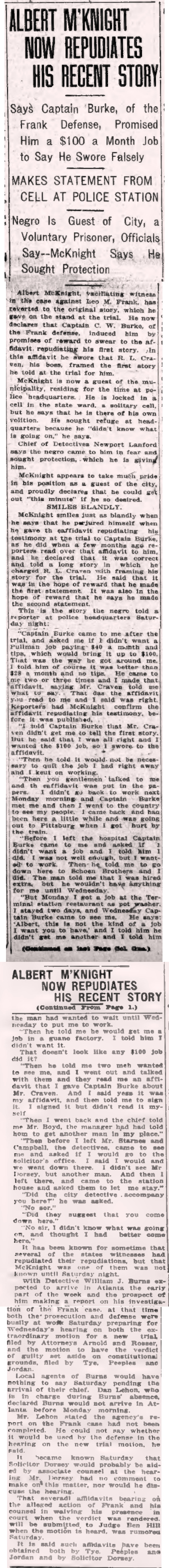 Captain Burke of the Frank Defense promised Albert Mc Knight a $100 a month job to say he swore falsely. Mc Knight, a vacillating witness in the case against Leo M. Frank, has reverted to his original story given on the stand at the trial. He now declares that Captain C. W. Burke, of the Frank defense, induced him by promises of reward to swear to the affidavit repudiating his first story. In this affidavit, he swore that R. L. Craven, his boss, framed the first story he told at the trial for him.